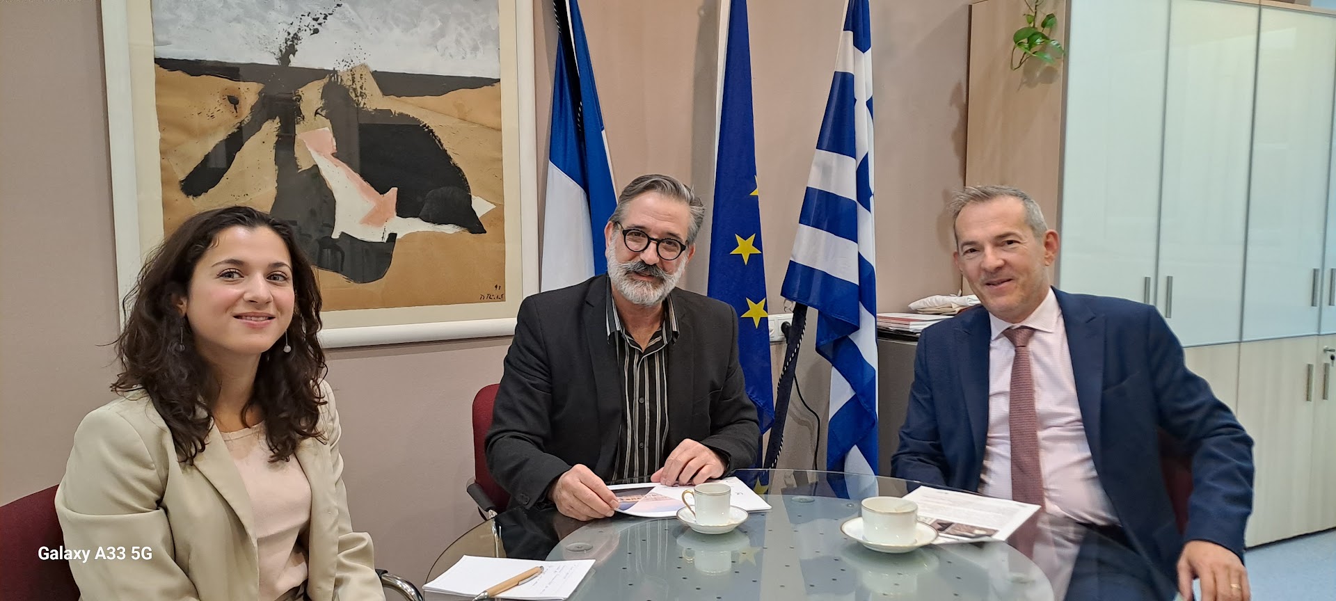 Mr. Jean-Luc Lavaud, Consul General of France in Thessaloniki and Ms. Eléonore Sirabyan, Head of Scientific Cooperation and Innovation at the French Institute of Thessaloniki, welcome Mr. Nikolas Kelpekis, COO of EuroPartenaire and representative in Greece of the French Federation of International Trade Experts OSCI, to a coordination session for the promotion of Greek French cooperation.